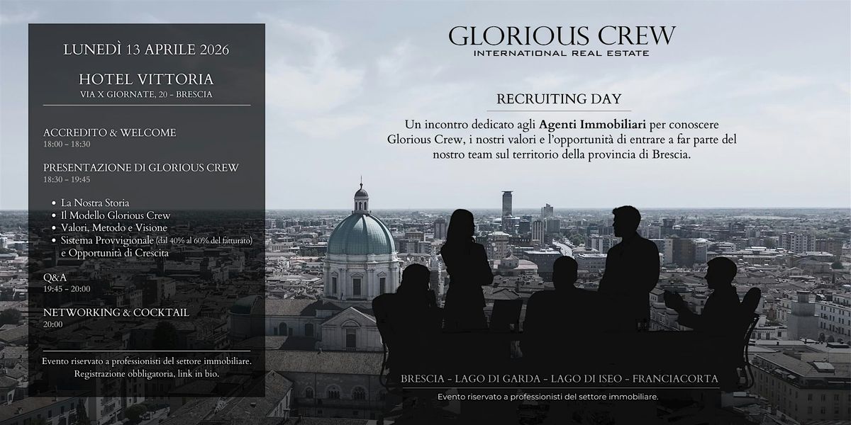Per questo abbiamo deciso di organizzare il primo Glorious Crew Recruiting Day, un incontro dedicato agli agenti immobiliari della provincia di Brescia interessati a conoscere più da vicino la nostra realtà.
