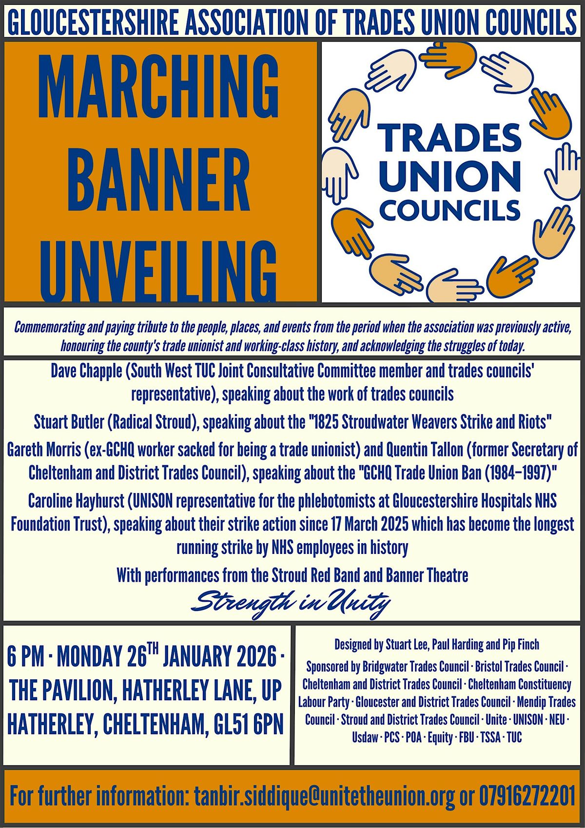 Thanks to the following organisations who donated toward the appeal for creating the banner: Bridgwater Trades Council, Bristol Trades Council, Cheltenham and District Trades Council, Cheltenham Constituency Labour Party, Equity Bristol and West of England Branch, Fire Brigades Union South West Region, Gloucester and District Trades Council, Mendip Trades Council, National Education Union Gloucestershire Branch, Pr*son Officers' Association National, Public and Commercial Services Union National, Public and Commercial Services Union Associated and Retired Members South West, UNISON Gloucestershire Districts Health and Community Branch, UNISON Gloucestershire Local Government Branch, Unite Community Bristol, Bath and Gloucester Branch, Unite Gloucester District Branch, Unite Gloucester District Retired Members' Branch, Unite South West Health Branch, Union of Shop, Distributive and Allied Workers Stroud, Cotswold and District Branch, Stroud and District Trades Council, Trades Union Congress and Transport Salaried Staffs' Association South East Wales General Branch.