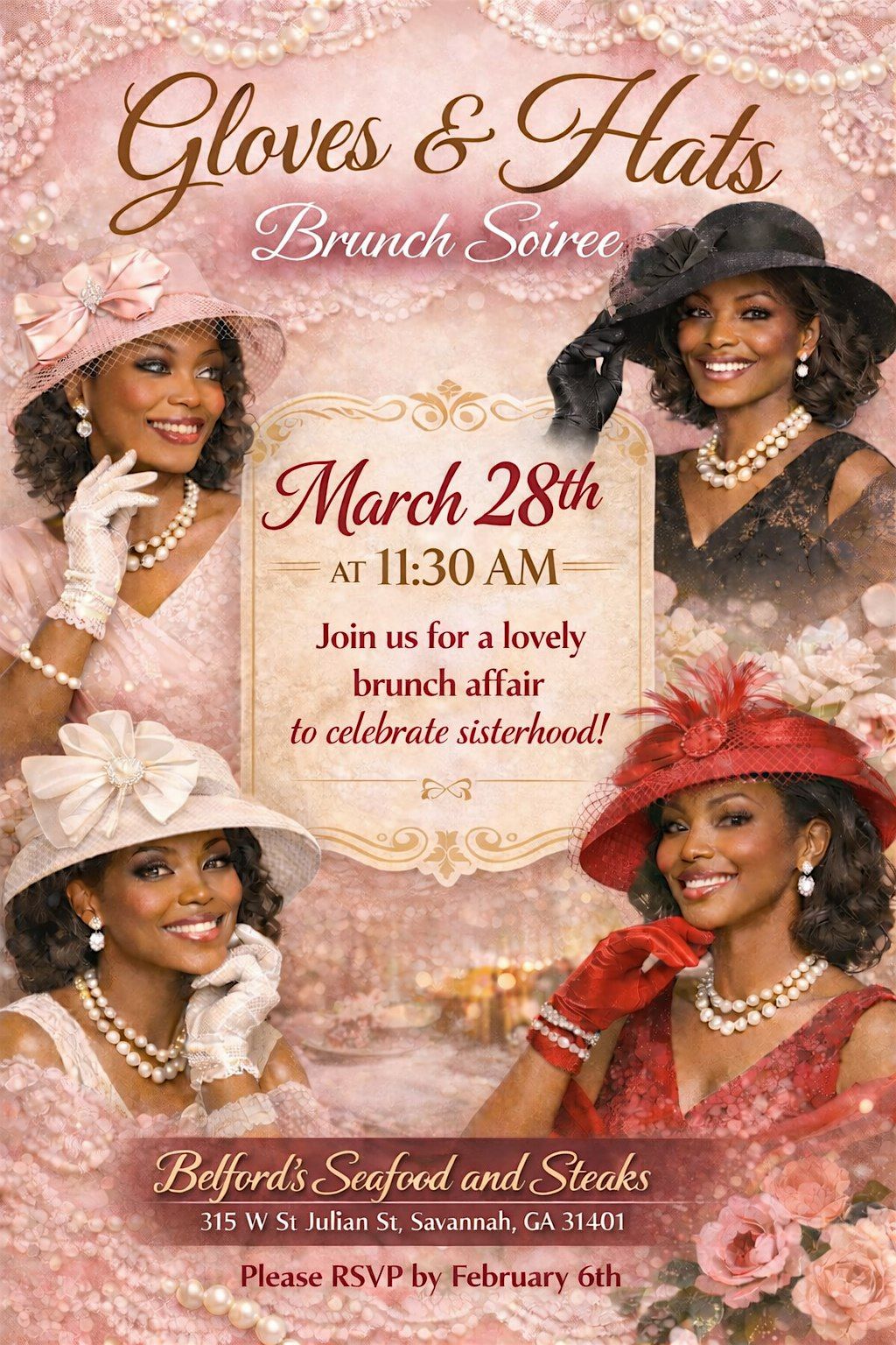 Join us for a fun afternoon wrapped up in style at the Gloves & Hats Brunch Soiree! It’s the perfect chance to rock your favorite gloves and hats, fellowship with melanin ladies, and enjoy some great vibes—all in person. Whether you’re a fashionista or just in for a good time, this event promises smiles and style. Don't miss out on the coziest gathering of the season!