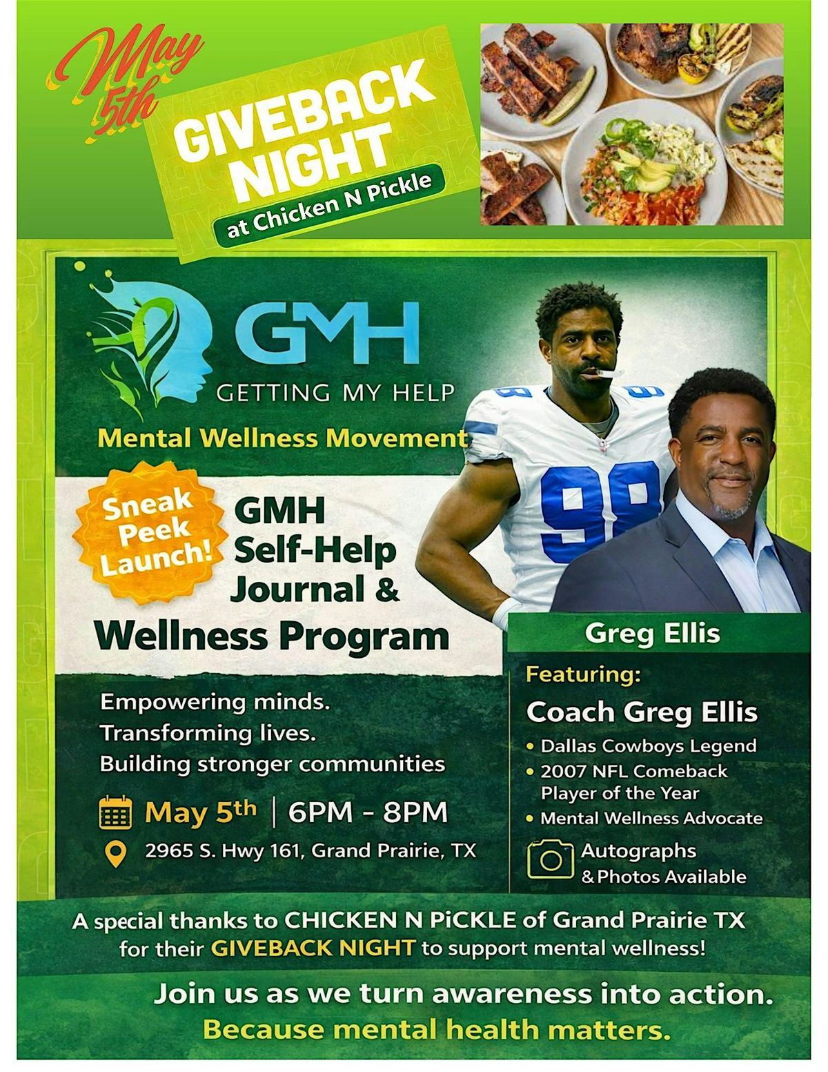 Join GMH Giveback Night! Support mental wellness, meet Coach Greg Ellis, and experience our Self-Help Journal launch. Eat, give back!