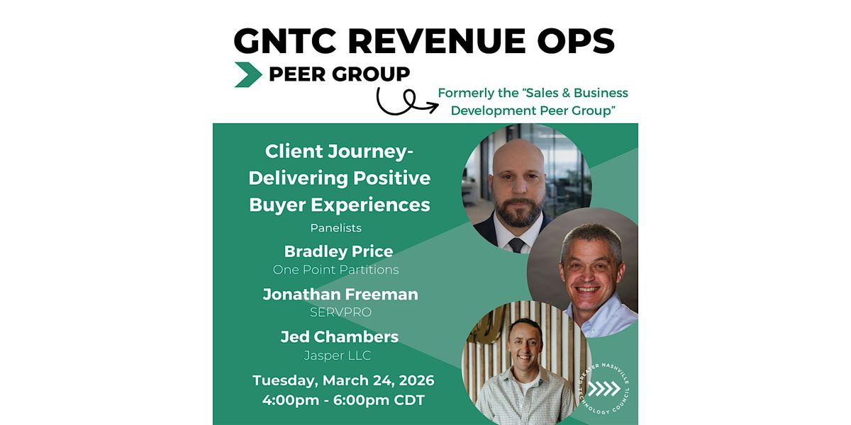 The GNTC Revenue Ops Peer Group hosts quarterly gatherings for revenue generating professionals across Middle Tennessee. This Q1 session, Client Journey: Delivering Positive Buyer Experiences, will bring together leaders who are responsible for driving growth, strengthening customer relationships, and improving performance across the full revenue lifecycle.