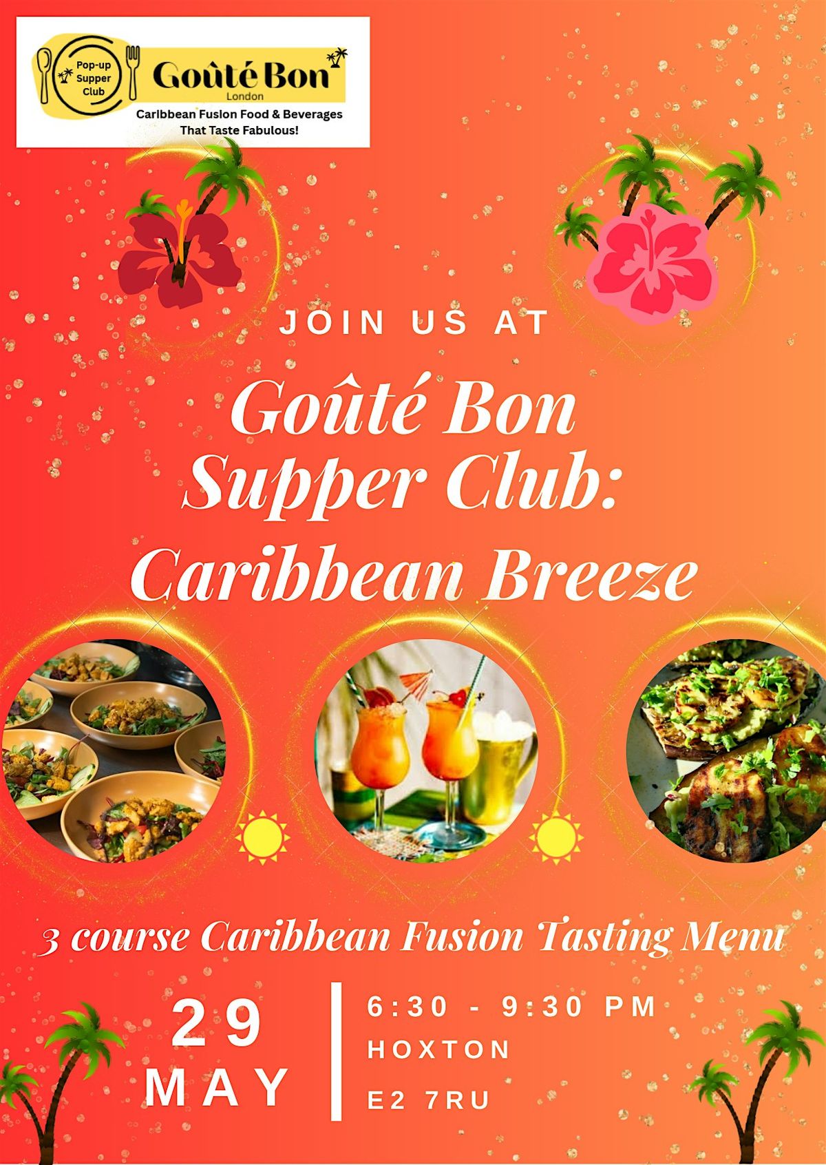 A vibrant 3-course Caribbean Fusion Tasting Menu with bold spices & tropical vibes made with love.