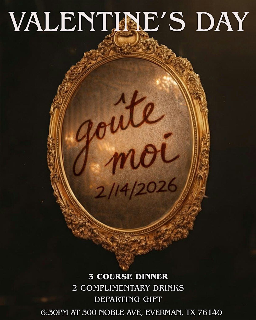Goûte Moi: Valentine’s 3-course French-inspired dinner in Dallas—hosted at the Rococo Dream House, a celebration of love’s taste.