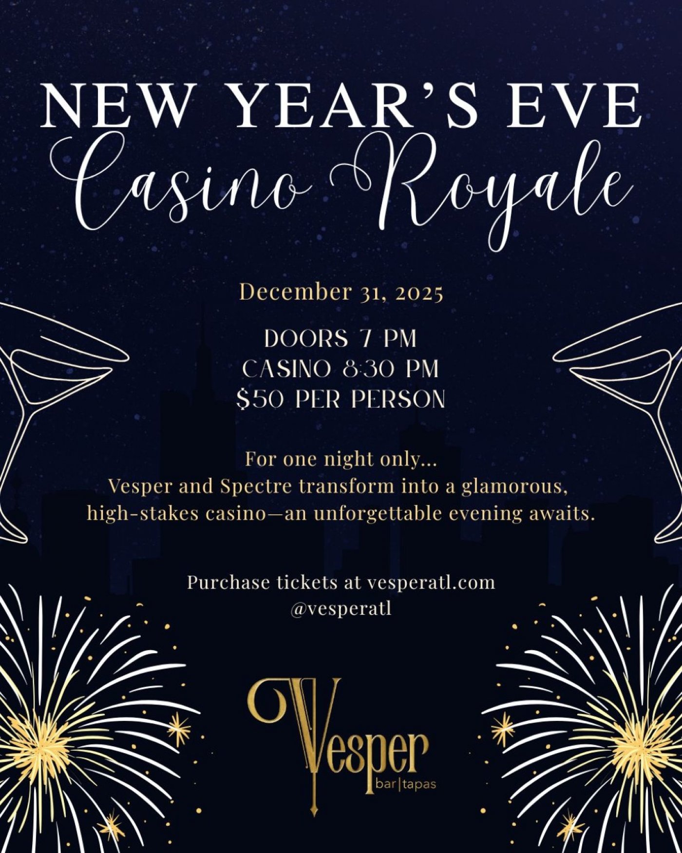 New Year’s Eve gets the James Bond treatment as Vesper rings in 2026 with a Casino Royale–inspired bash on Wednesday, December 31st. Beginning at 7 p.m., the Bond-inspired cocktail bar’s moody counterpart, Spectre, transforms into an elegant Monte Carlo–style gaming lounge featuring blackjack, craps, roulette, and more. The casino opens at 8:30 p.m., giving guests a chance to test their luck in true high-stakes fashion. As the night builds, passed hors d’oeuvres make their way through the room and a complimentary champagne toast is ready for midnight. At 11:30 p.m., chips are exchanged for raffle tickets toward a lineup of prizes revealed after the ball drops. At midnight, a cascade of balloons drops overhead, some holding cash-filled surprises for the evening’s luckiest players. It’s a night made for a dramatic sendoff to 2025 and an unforgettable start to 2026. Tickets are $50 per person and can be purchased at vesperatl.com. Vesper is located on the Atlanta BeltLine at 924 Garrett St. Suite D, Atlanta, GA 30316. Stay connected on Facebook and Instagram at @vesperatl.