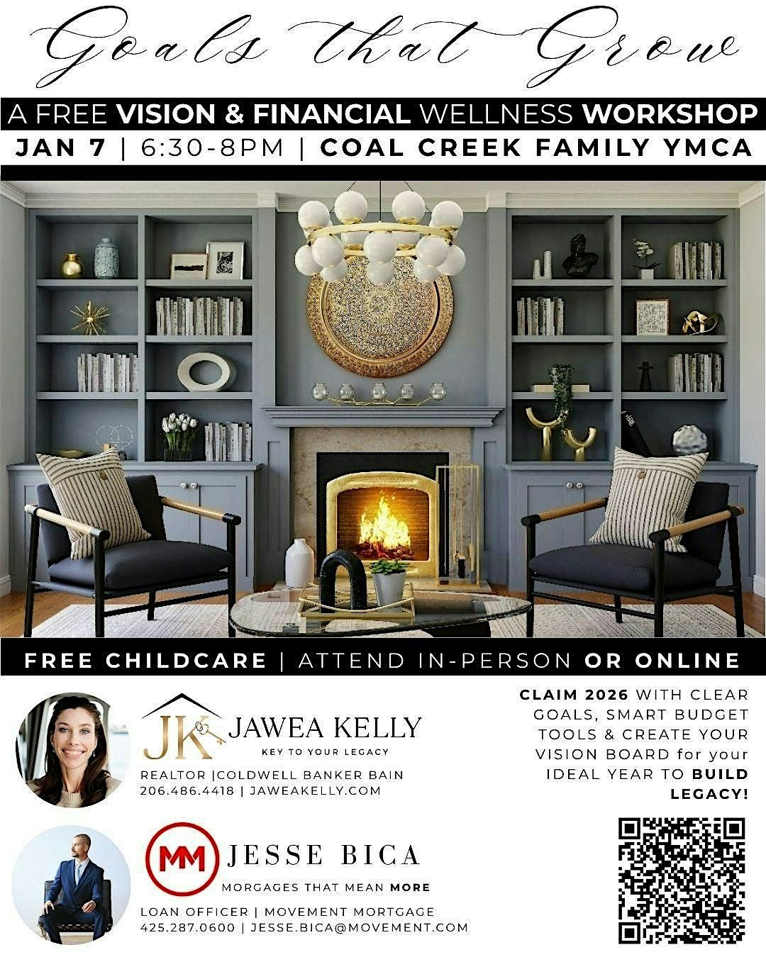 Claim 2026 with hosts: Jawea Kelly, Realtor (Coldwell Banker Bain) & Jesse Bica, Loan Officer (Movement Mortgage) with clear goals, smart budgeting, and vision board inspiration to help you build financial confidence and create your ideal year. Plus take advantage of Free Childcare* at the YMCA! OR Attend VIRTUALLY!