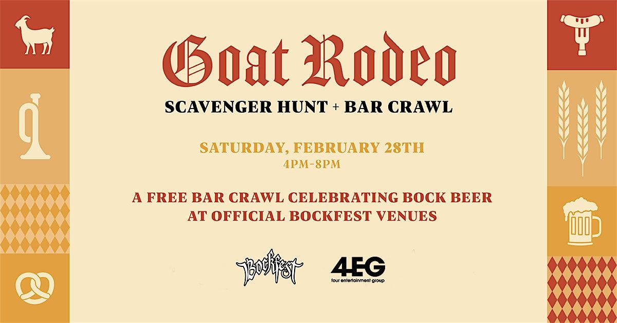 The Goat Rodeo is a free bock beer bar crawl and scavenger hunt that will take you through participating Bockfest venues leading up to the festival. π» Assemble your crew of 2 - 8 people and join us for a day of Bockfest fun on Saturday, February 28th, from 4pm - 8pm.