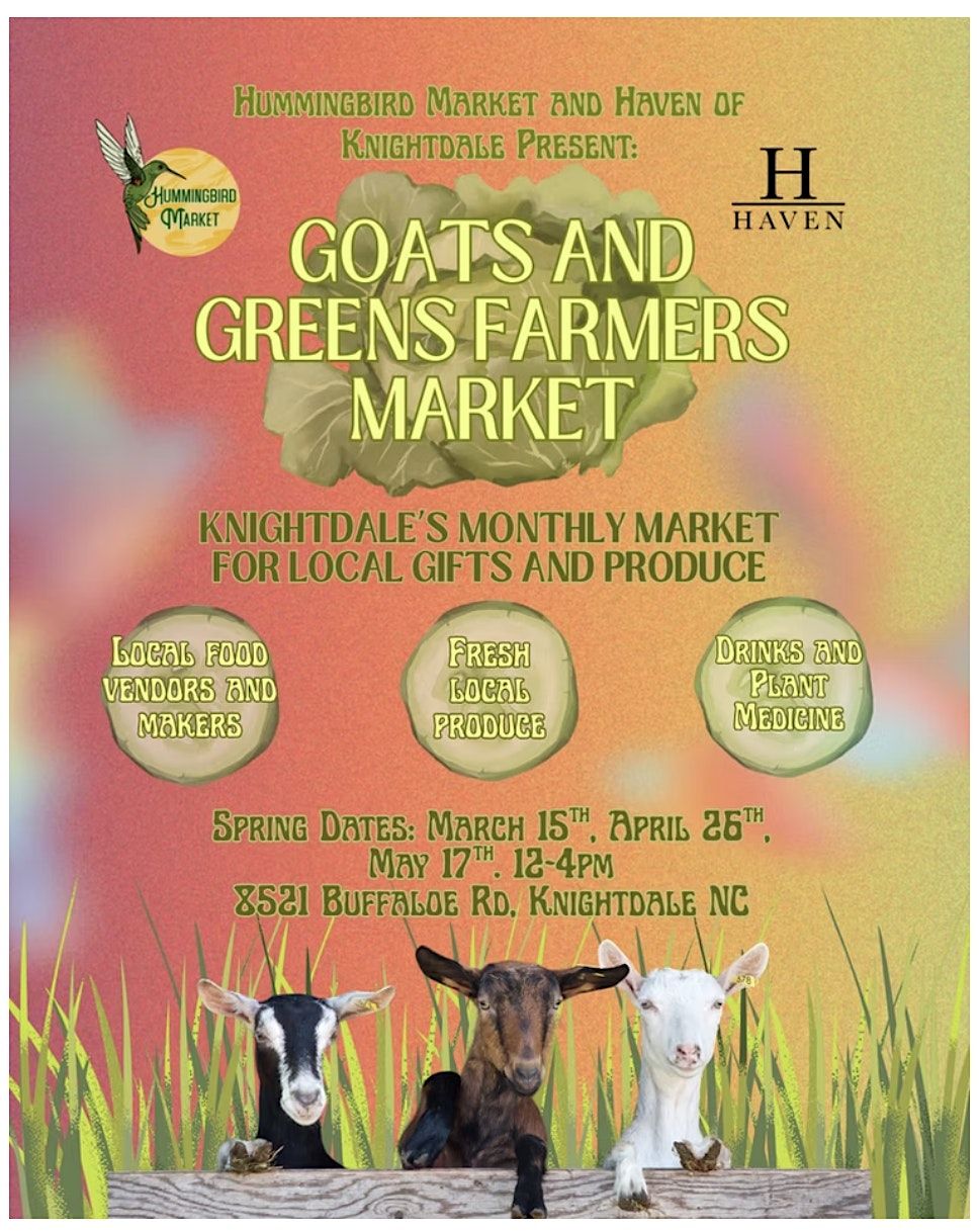 The Goats and Greens Farmer's Market is a monthly market hosted by Haven of Knightdale, featuring 20 local makers showcasing local produce, fresh and prepared food items, arts and crafts, and more!