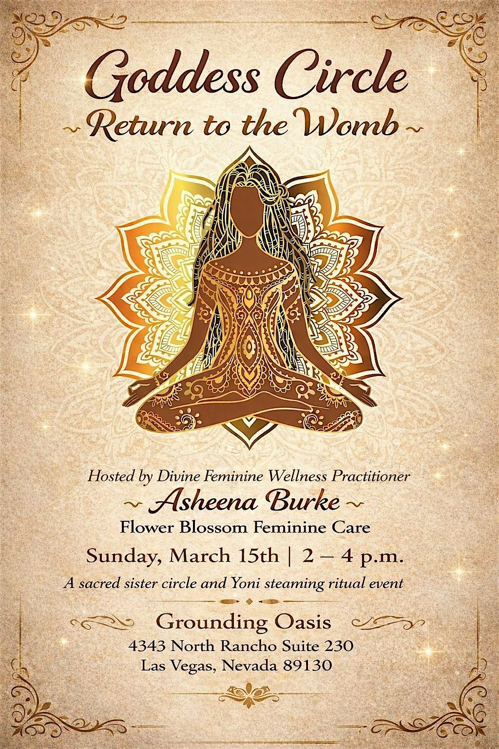 Join Asheena Burke, Yoni Steam Facilitator and Divine Feminine Healing Practitioner, for an intimate sacred gathering in honor of Women's History Month. The Goddess Circle is a safe, nurturing space where women come together to heal, learn, move, breathe and bloom.