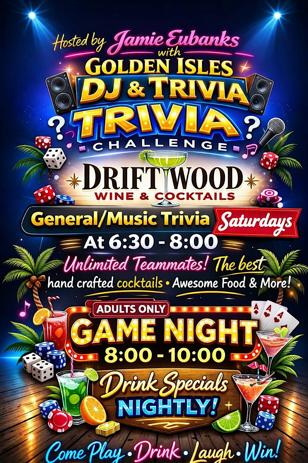 One of the funnest nights of the week! Jamie Eubanks of Golden Isles DJ & Trivia gets us started with general and music trivia - are YOU the smartest? Will YOU win??