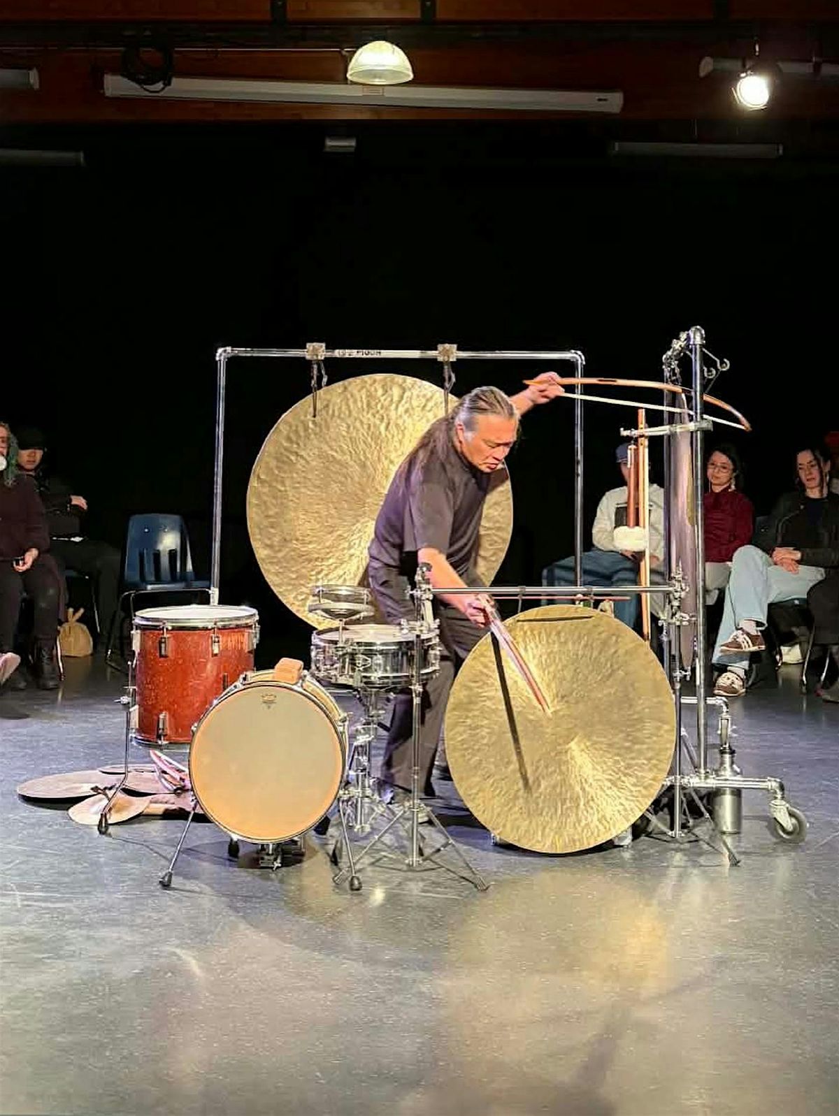 A wild assortment of drums, hand drums, bells, gongs, and bigger gongs! Gongs bowed and gongs bashed... an amazing array of sound.