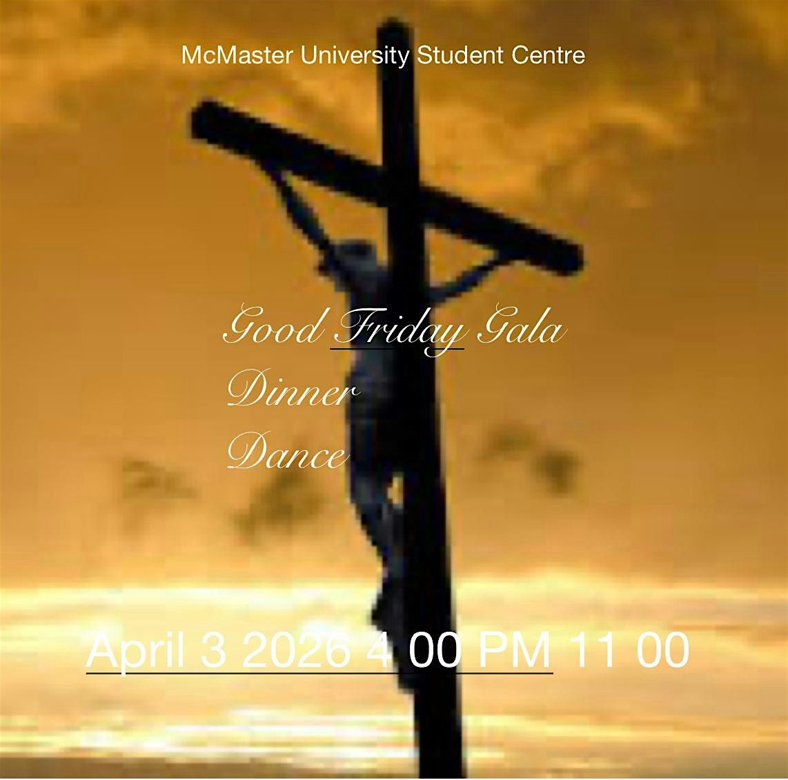 Welcome to the Good Friday Gala Dinner Dance at the McMaster University Student Centre! Get ready for a night of fun, food, and dancing on April 3, 2026 at 5:00 PM (Eastern Time). Join us for a memorable evening filled with great music, delicious food, and fantastic company. Don't miss out on this opportunity to dress up, let loose, and create lasting memories with friends and loved ones. We can't wait to see you there!