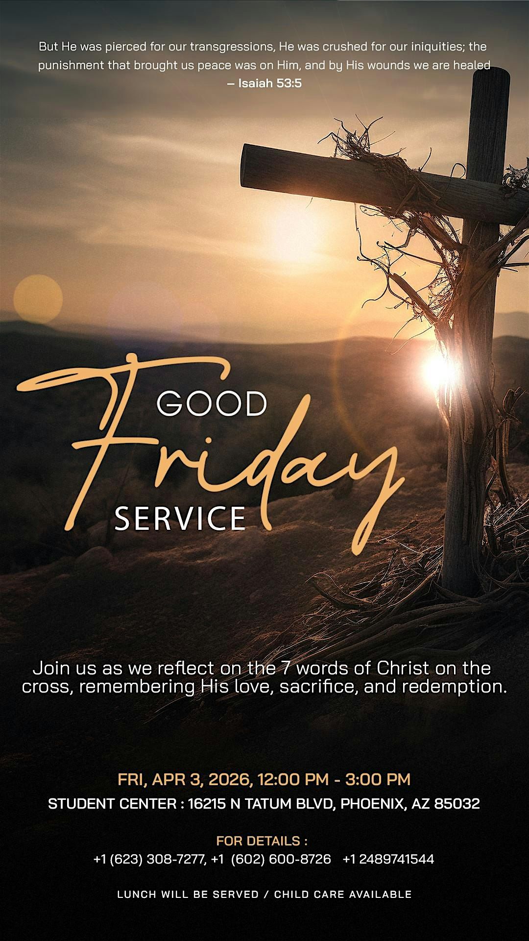 Welcome to our Indian Service for Good Friday! Join us for a meaningful gathering filled with prayers, hymns, and reflections on this solemn day. It's a time to come together as a community and remember the sacrifice made for us. Let's observe this day with reverence and gratitude. Don't miss this in-person service where we can worship together and reflect on the significance of Good Friday. We look forward to having you with us.
