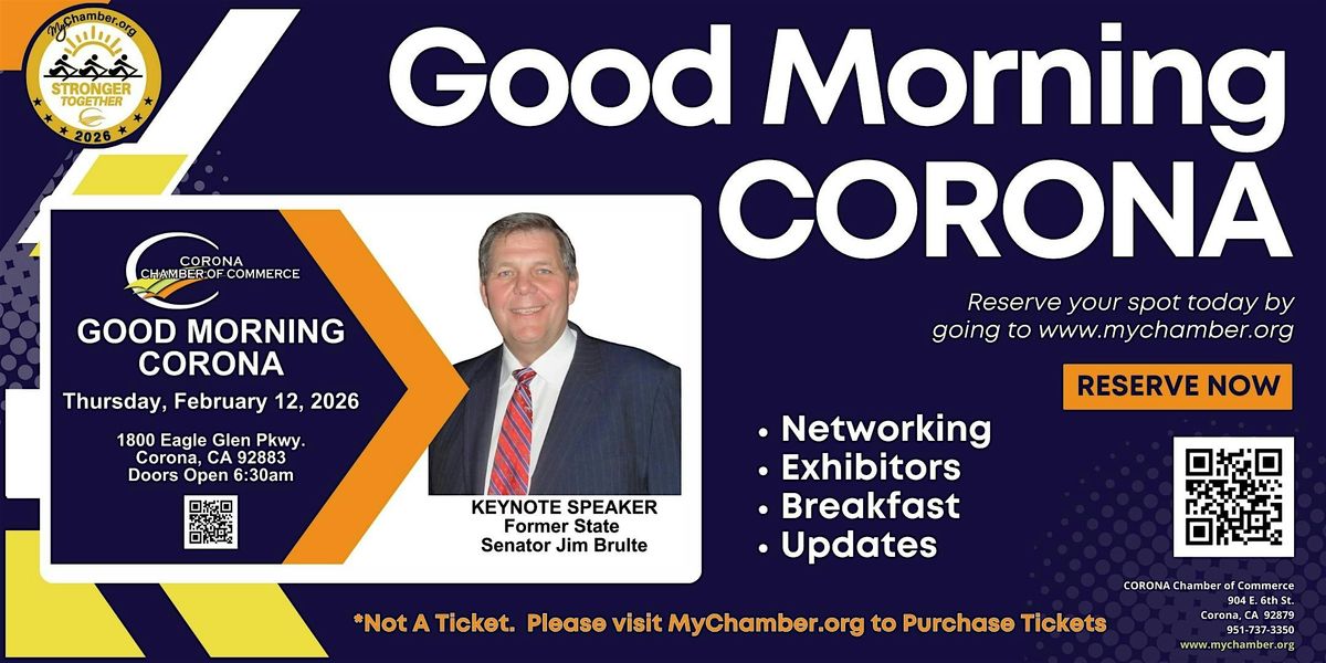 Good Morning Corona brings together the business community for a morning of networking, local updates, and valuable insights. Join us as our featured keynote speaker shares timely updates, discusses current initiatives, and highlights important issues impacting our region. Start your day with connection, knowledge, and community engagement. Tickets purchased at MyChamber.org