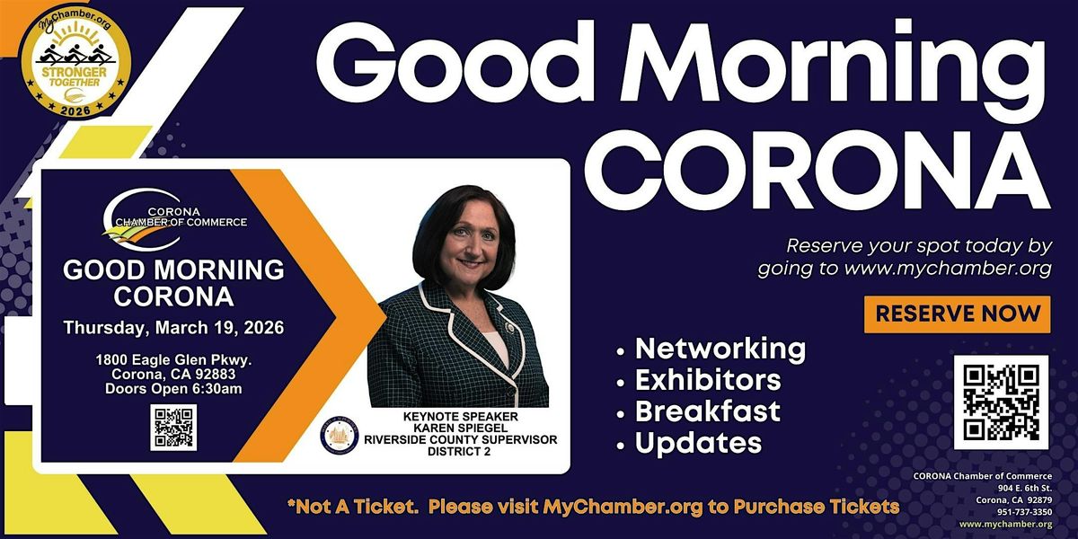 Good Morning Corona brings together the business community for a morning of networking, local updates, and valuable insights. Join us as our featured keynote speaker shares timely updates, discusses current initiatives, and highlights important issues impacting our region. Start your day with connection, knowledge, and community engagement. Tickets at MyChamber.org