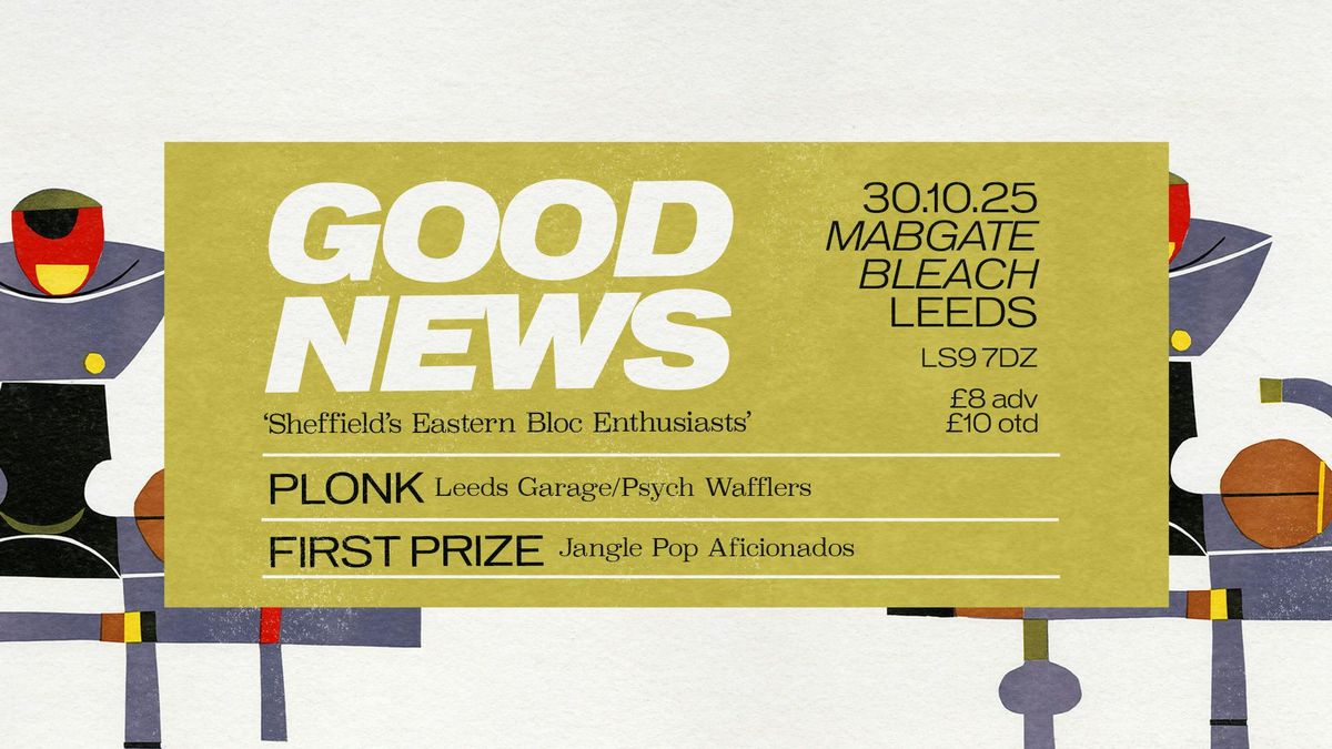 Sheffield's wonk-pop eastern block enthusiasts, Good News are wanging themselves up the way to Leeds for an absolute belter! Joining them are the wonderful jangle pop aficionados and fellow Sheffield heads First Prize. Finally we have local plonkers, the garage/psych wafflers Plonk! Gonna be a right good'un, so get yer arses down!