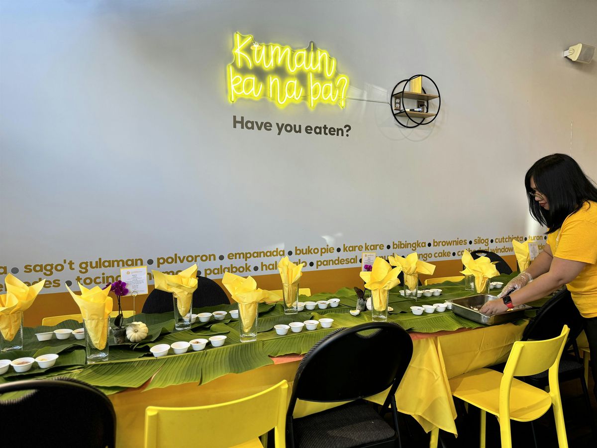 A Filipino-style feast, sharing a generous spread of food served without plates. At the center is a mound of rice surrounded by Filipino favorites like bbq, milkfish, lechon kawali, ukoy along with salted eggs, tomatoes, eggplant and bagoong for extra flavor. Everyone eats with their hands—kamayan style—which makes the experience casual, festive, and full of camaraderie. The simple setup, often decorated with banana leaves and tropical touches, adds to the cheerful atmosphere. It’s a little messy, a lot of fun, and all about togetherness and sharing good food with great company.