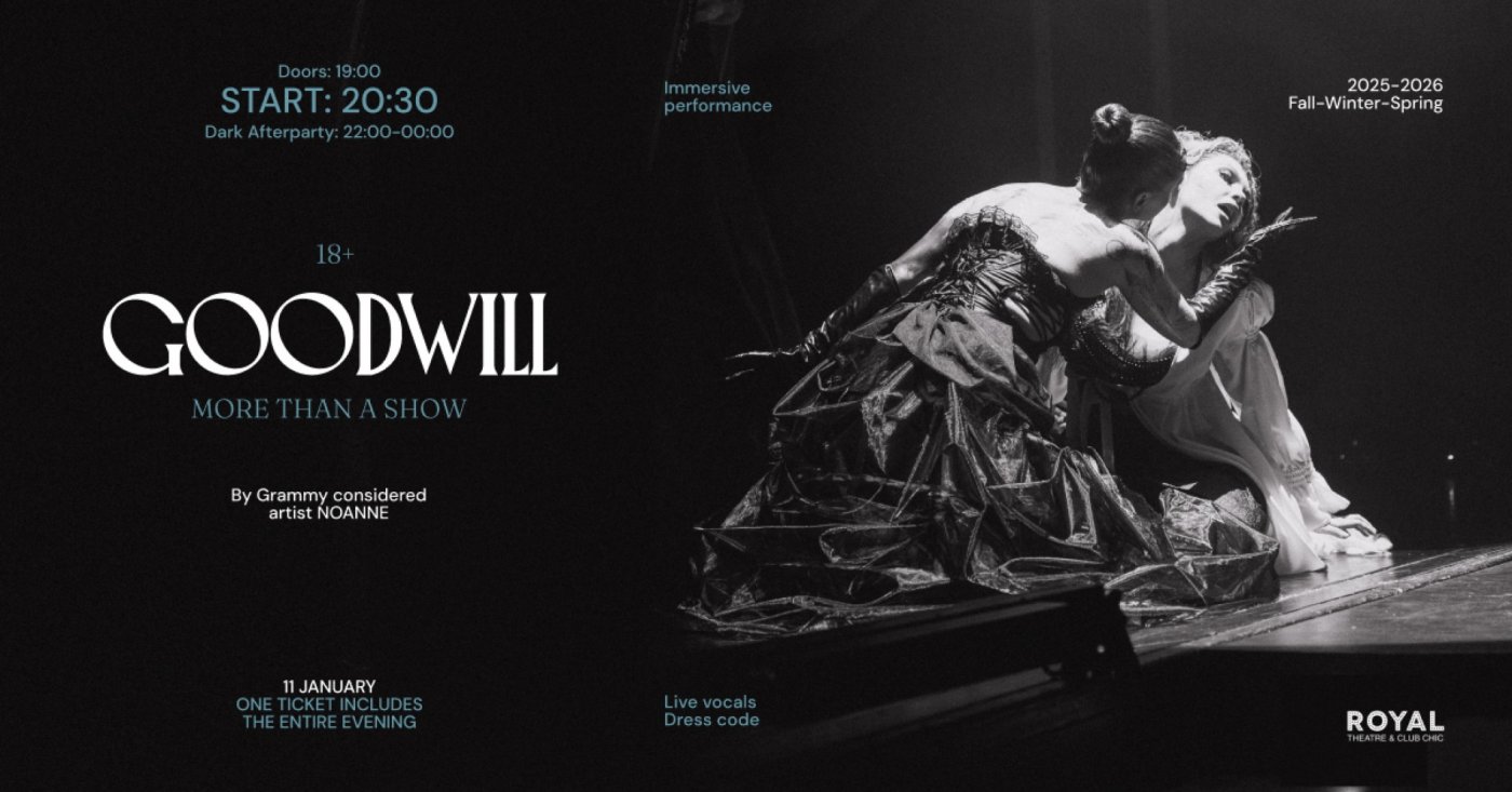 Temná, vizuálně silná hudebně-divadelní performance, ve které divák není jen pozorovatel. GOODWILL Show propojuje živý zpěv, choreografii, scénografii a vizuální design do jednoho světa — a publikum do něj vstupuje hned u dveří: masky dostává při příchodu.