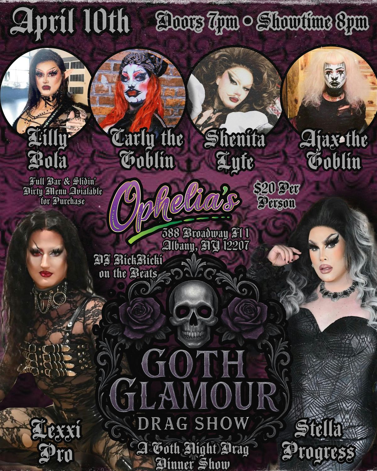 Join us at Ophelia's For a Goth Night Drag Show! This Drag dinner show serves a stunning gothic lineup that you don't wanna miss! Stella Progress and Lexxi Pro are back with all of the fun and fabulous antics you can imagine! Join your hostesses, are Oneonta's own, Lilly Bolla, Plattsburgh's Shenita Lyfe, local favorites Carly the Goblin and AJax the Goblin. Back on the beats is DJ RickRicki! Enjoy the full menu from Slidin’ Dirty and the full bar available for purchase!