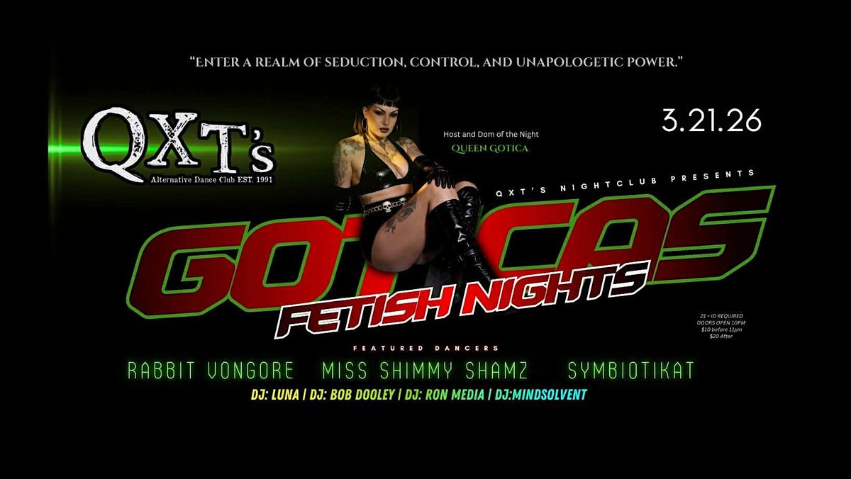 Step into the world of Goticas Fetish Nights, where alternative energy, fetish fashion, and dark dance culture collide. Hosted by Queen Gotica, your Dom of the night, this is an immersive experience designed for those who embrace confidence, creativity, and bold self-expression.