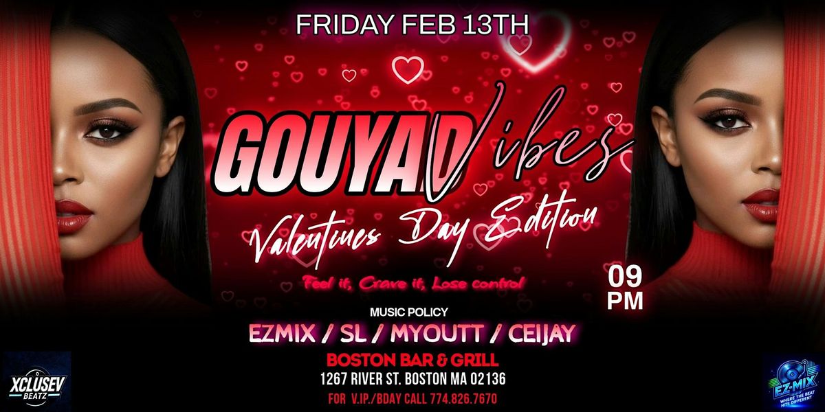 GOUYAD VIBES: VALENTINE’S DAY EDITIONGet ready for a night of love, rhythm, and unforgettable vibes on Friday, February 13thWhether you’re coming with your significant other, your friends, or ready to mingle, this is the ultimate Valentine’s nightlife experience in Boston.Feel the seductive sounds of Kompa, Gouyad, and smooth Caribbean groovesin a red-lit, romantic atmosphere designed to keep the dance floor moving all night longMusic by EZMIX, SL, MYOUTT, and CEIJAY will set the mood with nonstop energy.Boston Bar & Grill1267 River St, Boston, MADoors open at 9PM |21+Dress to impressand come ready to dance, connect, and celebrate loveTickets available nowVIP/Birthday sections: 774-826-7670Feel it. Crave it. Lose control.#GouyadVibes #ValentinesDayEdition #BostonNightlife #KompaVibes #Gouyad #CaribbeanNight #LoveAndVibes #BostonEvents #DanceAllNight