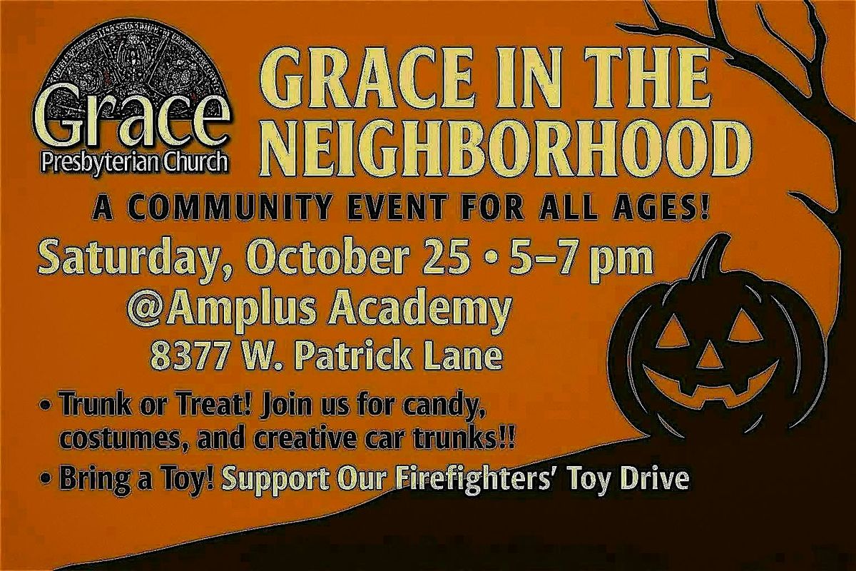Grace in the Neighborhood is back with Trunk or Treat! Please join us for a family-friendly evening of candy, costumes, and creative car trunks, to be held at the AMPLUS ACADEMY, Durango Campus, at 8377 W Patrick Lane from 5-7 p.m. on Saturday, October 25. Bring a toy to support our Firefighters' Burn Foundation Toy Drive. This is a FREE community event hosted by Grace Presbyterian Church. For further information, please contact Courtney at [email protected].