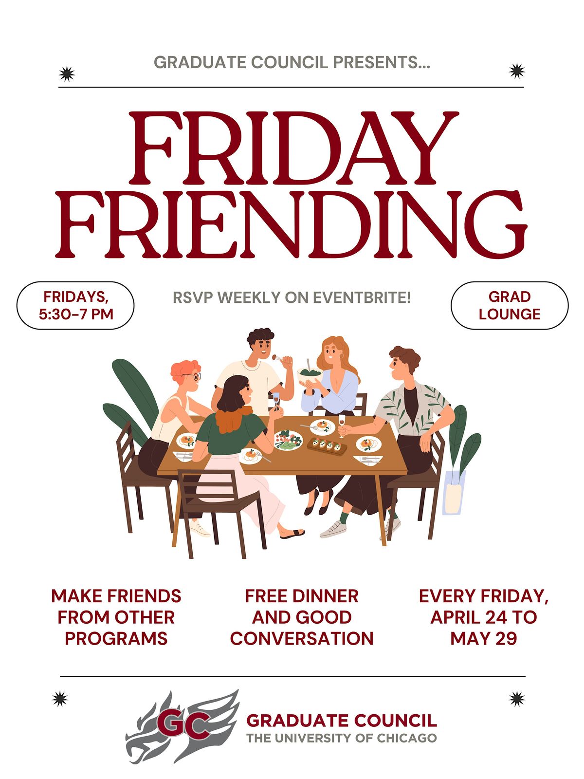 Looking to make new friends? Want to meet people from other divisions and schools? Join Graduate Council for Friday Friending and connect with graduate students from all across the University of Chicago!