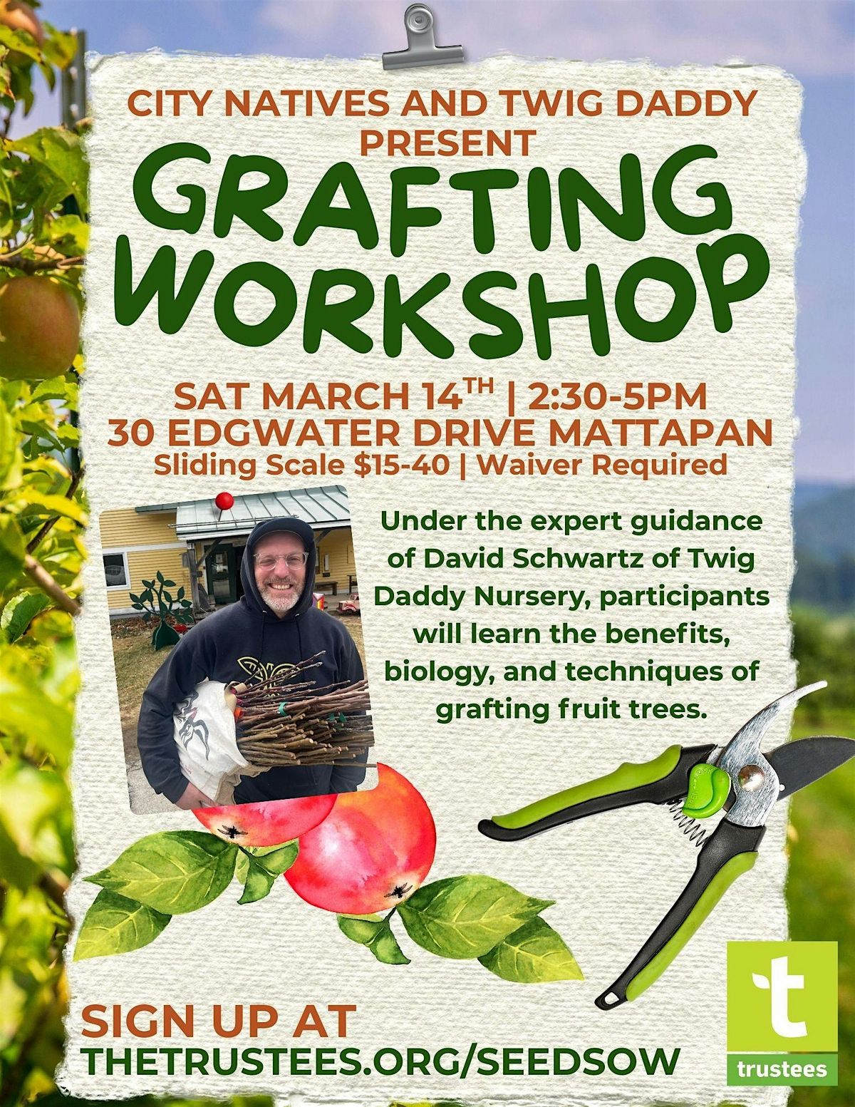 Under the expert guidance of David Schwartz of Twig Daddy Nursery, participants will learn the benefits, biology, and techniques of grafting fruit trees. A brief lecture will be followed by a demonstration, and plenty of time to try your own hand at grafting apple trees!