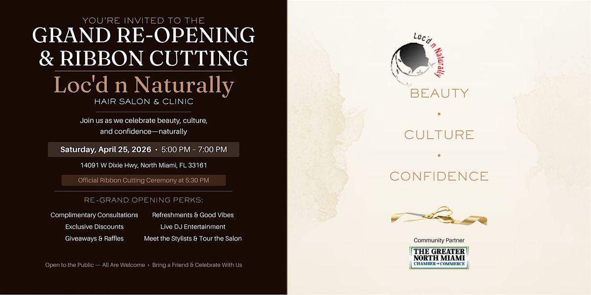 Join us for the Grand Re-Opening & Ribbon Cutting of Loc’d n Naturally Hair Salon & Clinic—an evening dedicated to beauty, culture, and confidence.