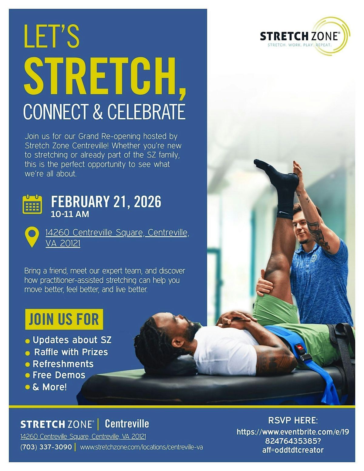 Come celebrate with us in person and experience the all-new StretchZone Centreville. We're pumped to show off our refreshed space and share some great vibes. Whether you're a long-time fan or new to the stretch scene, this is the perfect chance to check out what’s new!