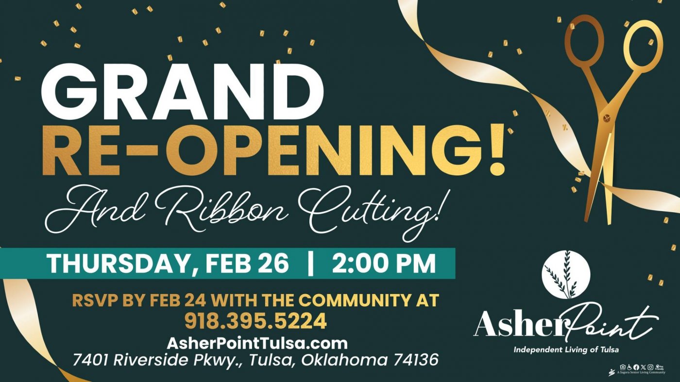 The renovations are complete! Asher Point Independent Living of Tulsa is celebrating with a Grand Reopening and official ribbon-cutting ceremony alongside the Tulsa Regional Chamber.
