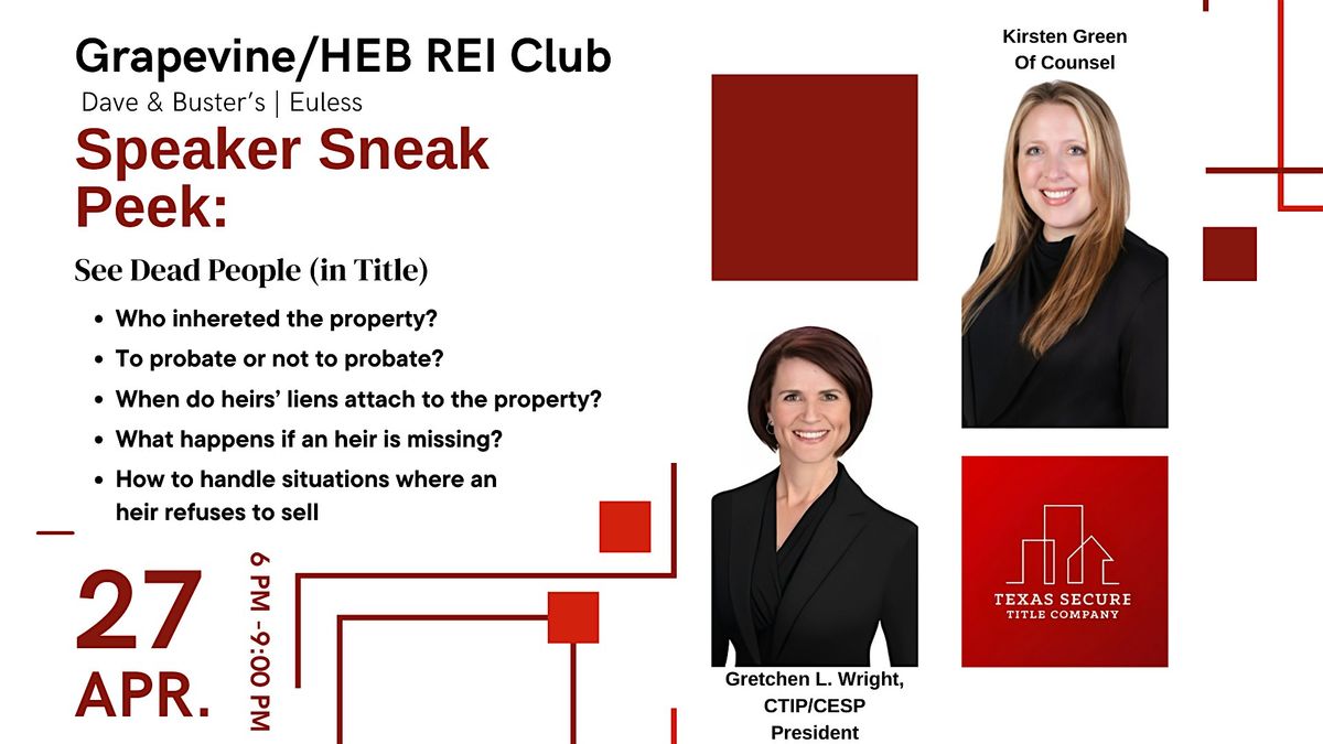 We are bringing in the leadership team from Texas Secure Title Company. Kirsten Green (Of Counsel) and Gretchen Wright (President) will speak on “See Dead People (in Title)” to help you identify red flags before they cost you time and earnest money.