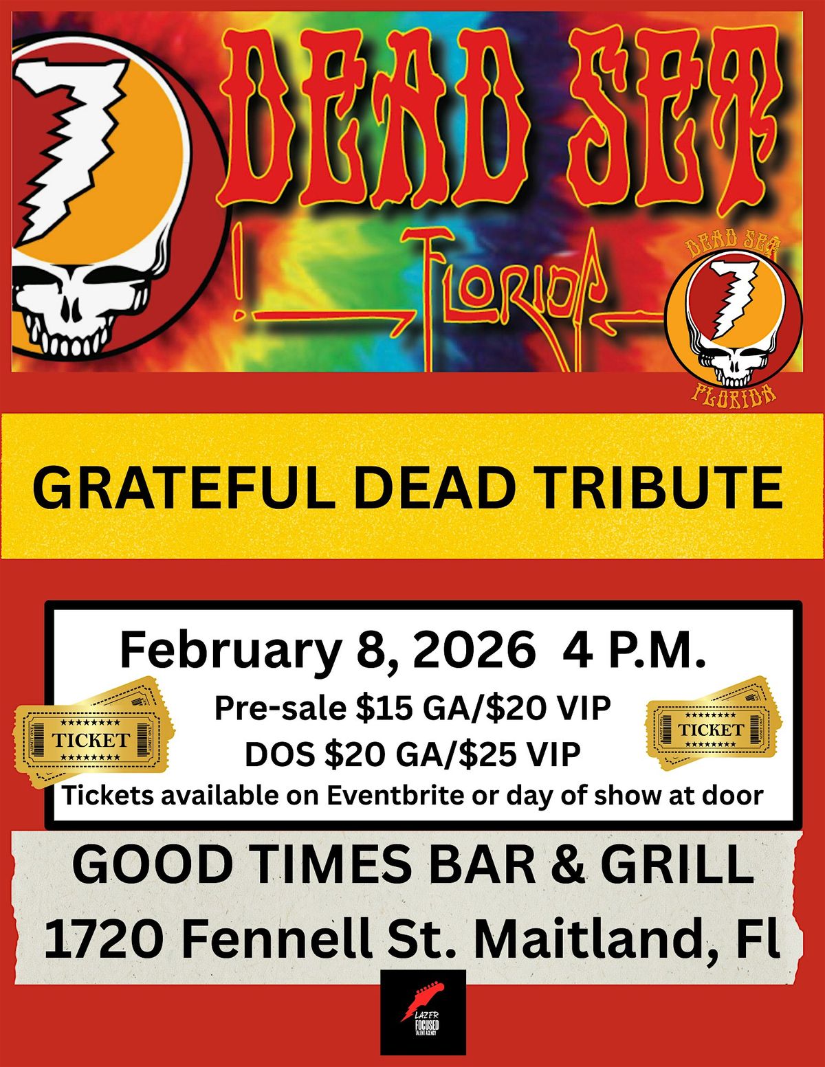 Get ready to relive the magic of the Grateful Dead with Dead Set Florida! This in-person event brings the legendary jams and iconic vibes straight to you. Whether you’re a longtime fan or just discovering their sound, it’s the perfect night to celebrate the spirit of the Dead. Don’t miss out on this groovy tribute—let’s make some memories together! Performing your favorite GRATEFUL DEAD hits on a SUNDAY FUNDAY matinee show!