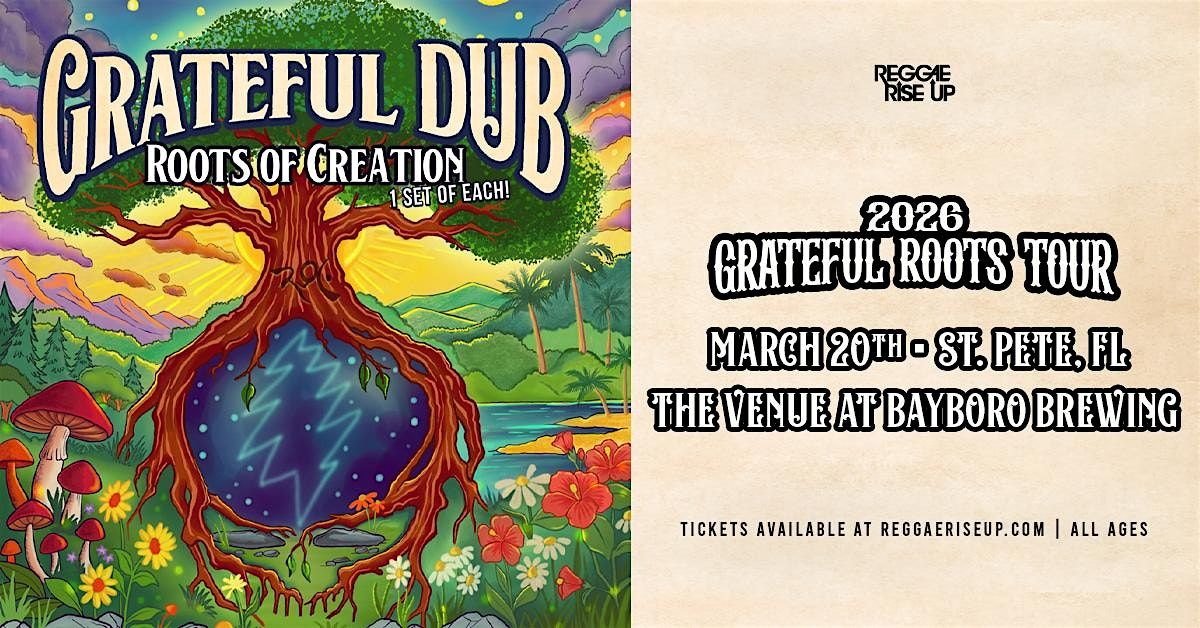 St. Petersburg, FL - Get ready for an epic night with GRATEFUL DUB & Roots of Creation, where the classic vibes of the Grateful Dead meet the smooth rhythms of reggae! This in-person event is all about laid-back grooves, good vibes, and timeless tunes reimagined with a reggae twist. Whether you're a Deadhead or just love chill sounds, this tribute will have you dancing and feeling the love all night long. Don’t miss out on the fun — come vibe with us!