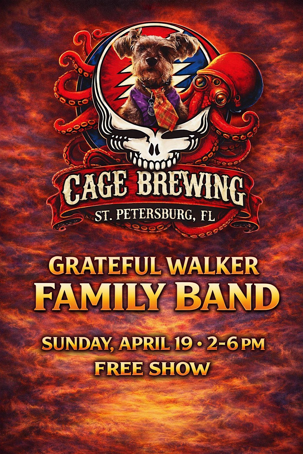 Come hang out with the Grateful Walker Family Band and special guest 18-year-old Steven Kortie for a chill afternoon of great tunes and good vibes. The show kicks off on April 19, 2026 at 2:00 PM (Eastern Time) at Cage Brewing in St. Pete. Bring your friends, grab a drink, and enjoy some live music in a laid-back setting. Don’t miss out! Pepper may make an appearance so don't miss it!