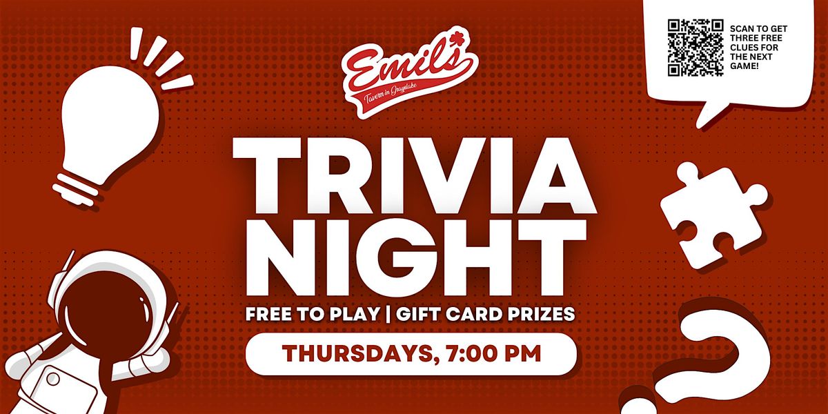 Join us for free live trivia every Thursday at 7pm at Emil's Tavern on Center in Grayslake, IL! Free to play, and top teams win gift card prizes!