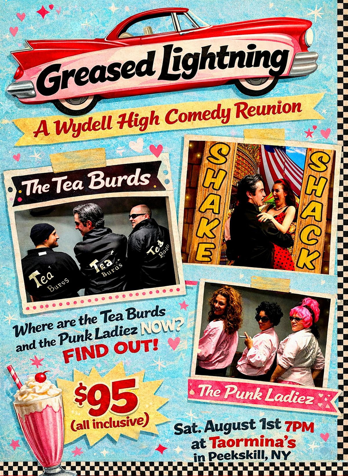 where principal McKnee hosts and asks ALL the juicy questions of the greasers, the punk ladies, and the Tea Burds! Did Danny Duko and Candie Olson have a happy ending? Does Wrenchy still have pink hair? Did Clutzey or Kehickey ever date the dancing queen TAH TAH or did one of them settle down with Grizzo? Find out, dress up or dress down, and come out to the Wydell Wino’s high school reunion and catch up with everyone! This hilarious, audience interactive parody/comedy DINNER THEATER EVENT will have you laughing until you cry the entire evening!