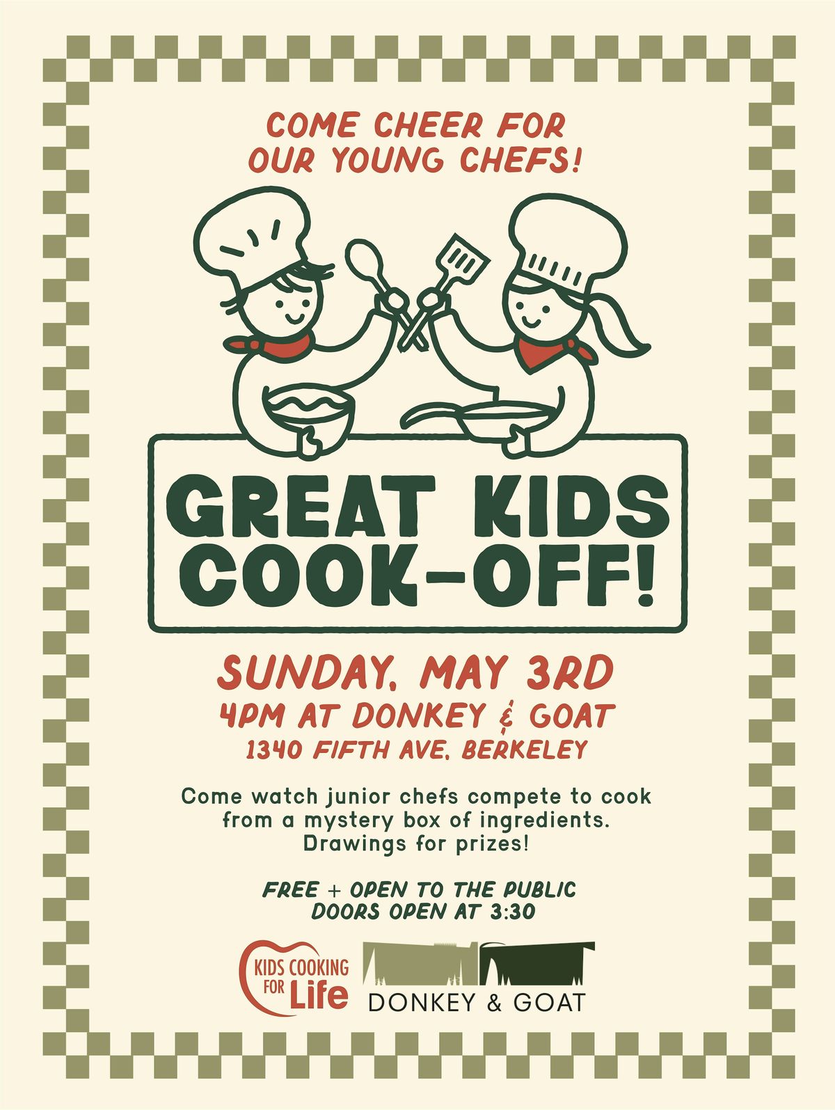 Back by popular demand, The Kids Cook-Off is returning this year with events in both the North Bay and East Bay! Our junior chefs will team up, cook with a mystery box of ingredients, and compete for exciting prizes.