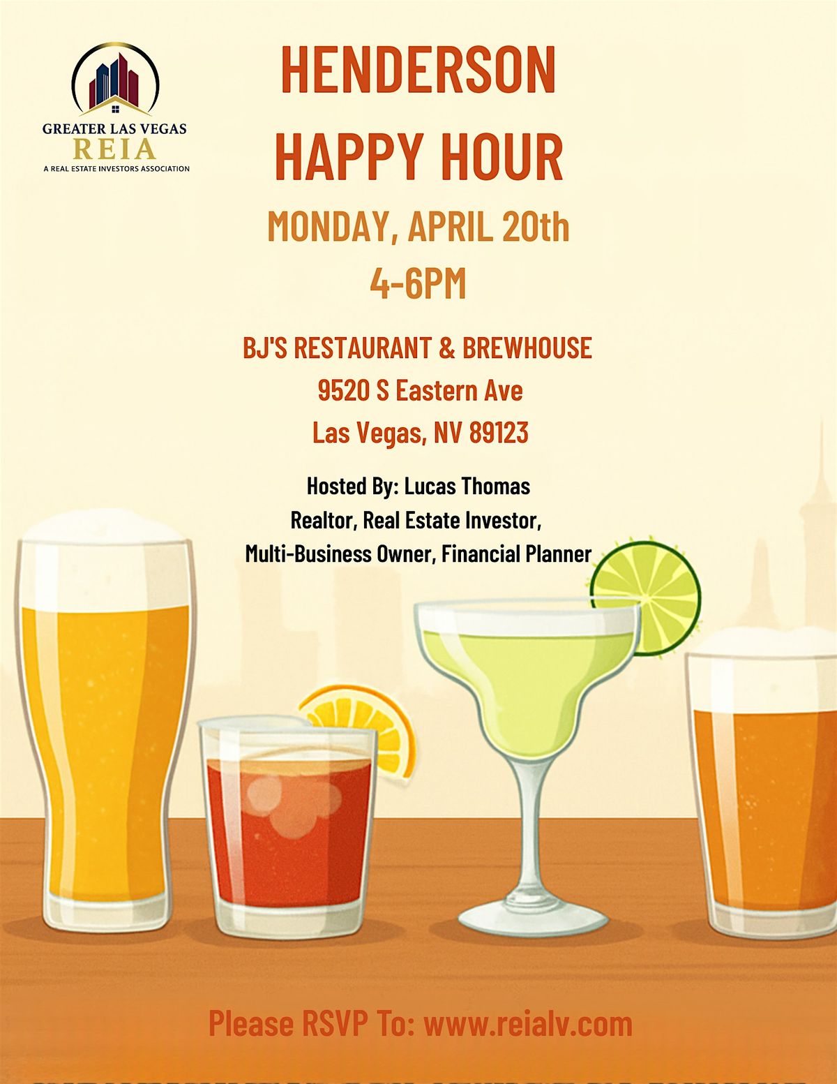 Join us for the Greater Las Vegas REIA Henderson Happy Hour, an awesome chance to network with local real estate pros in a relaxed, in-person setting. Whether you're a seasoned investor or just curious, come hang out, share ideas, and make new connections in Henderson. Grab a drink, kick back, and chat about all things real estate with fellow enthusiasts. Don’t miss out on the fun and valuable insights!