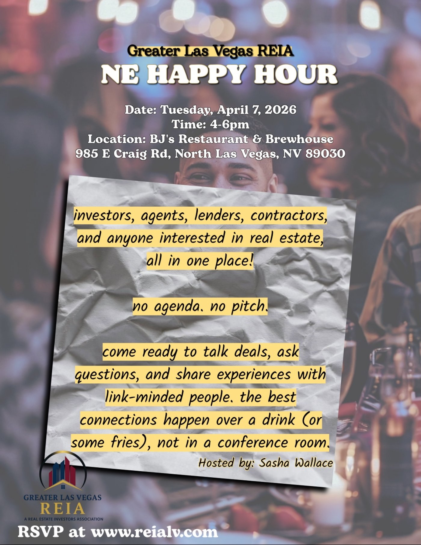 Greater Las Vegas REIA presents our newest happy hour in Northeast Las Vegas. This happy hour will take place every first Tuesday each month. This is a great opportunity to network with real estate professionals and other business associates. This monthly event is hosted by Sasha Wallace.