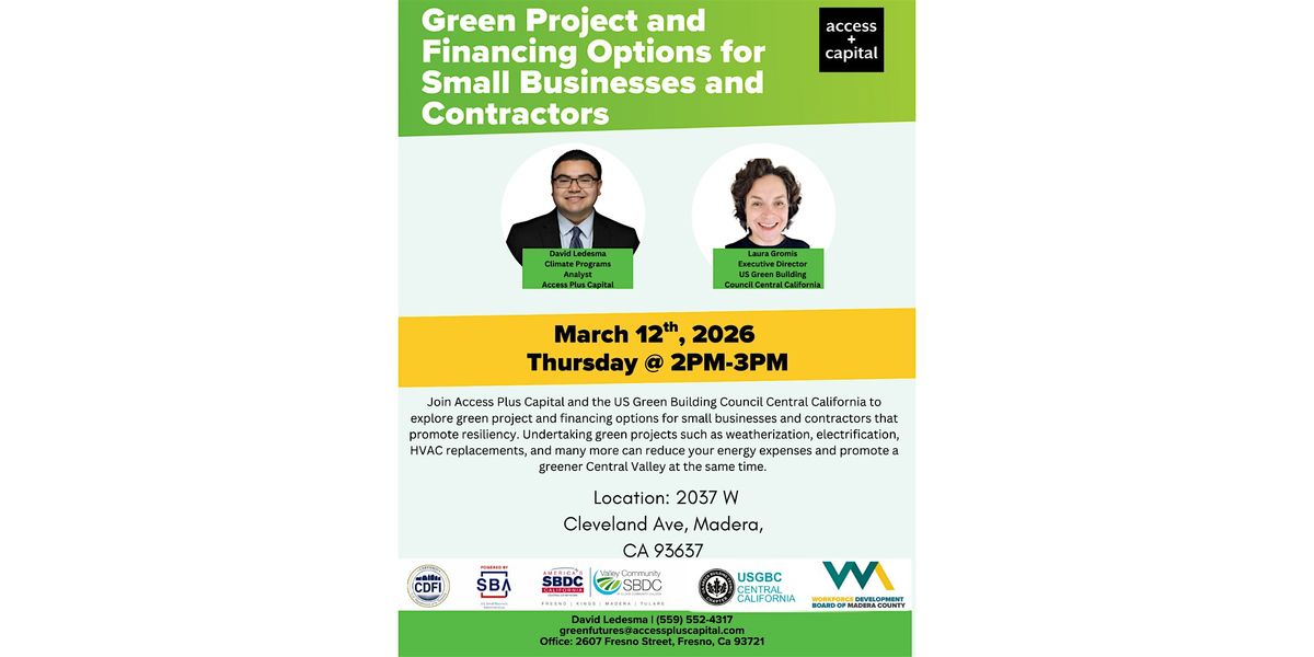Join Access Plus Capital and the US Green Building Council, Central California to explore green project and financing options for small businesses and contractors that promote resiliency. Undertaking green projects such as weatherization, electrification, HVAC replacements, and many more can reduce your energy expenses and promote a greener Central Valley at the same time.