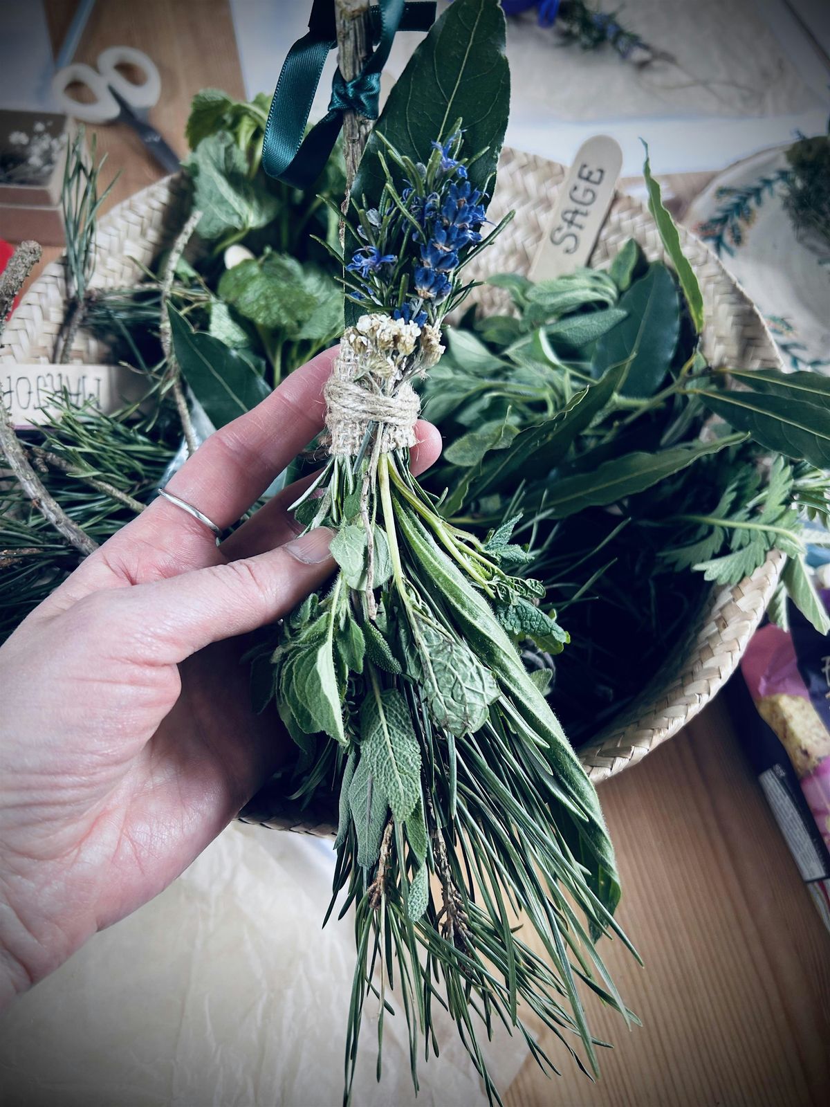 Make a herbal besom/broom as a spring decoration and as a symbol for seasonal cleansing and renewal. We will get to know a selection of locally grown herbs and wildflowers and their traditional magical properties. We will select herbs we wish to work with to create our broom with intention, using mugwort sticks provided for handles. We will also learn ways of working in ritual and ceremony with the besom with a short ritual at the end to cleanse energy and draw it too us. You will take home your fresh herbal besom to hang up to dry.