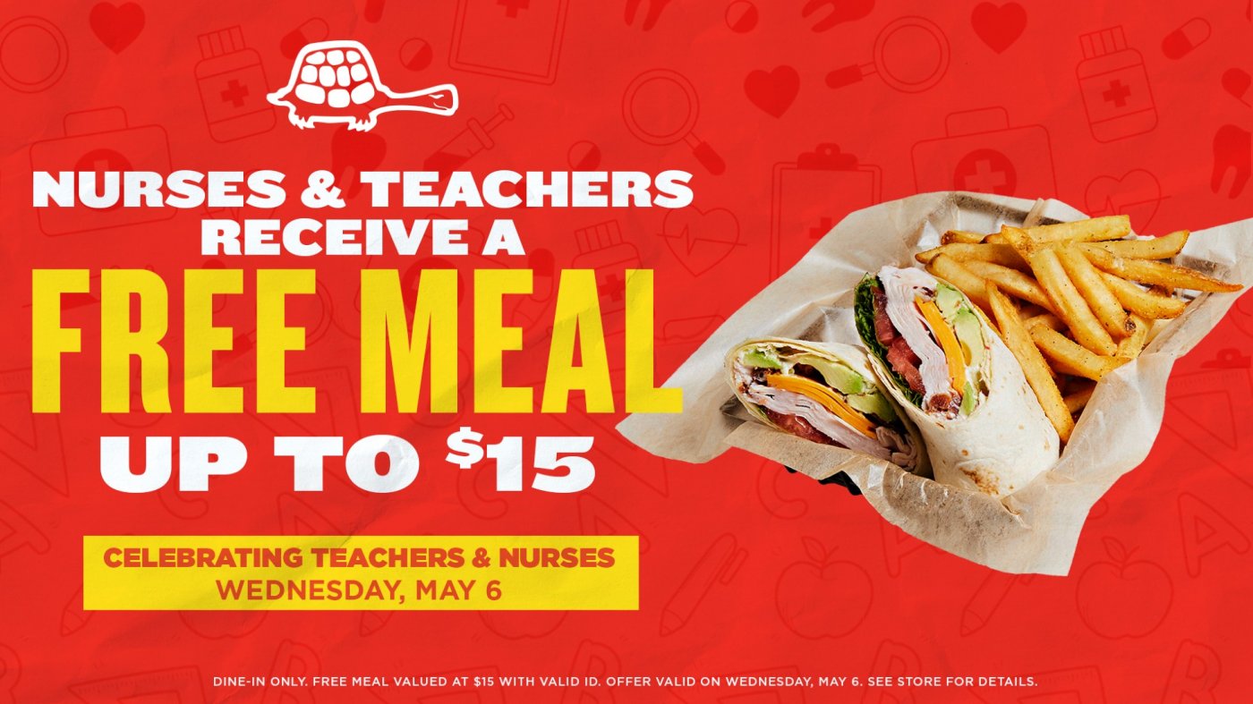 To celebrate National Teacher & Nurses Week, The Greene Turtle is honoring nurses and teachers with a FREE meal on Wednesday, May 6! This offer is valid for dine-in guests only with a valid ID, up to a $15 value. It’s a small gesture to show big appreciation for those who give so much every day. 🎉