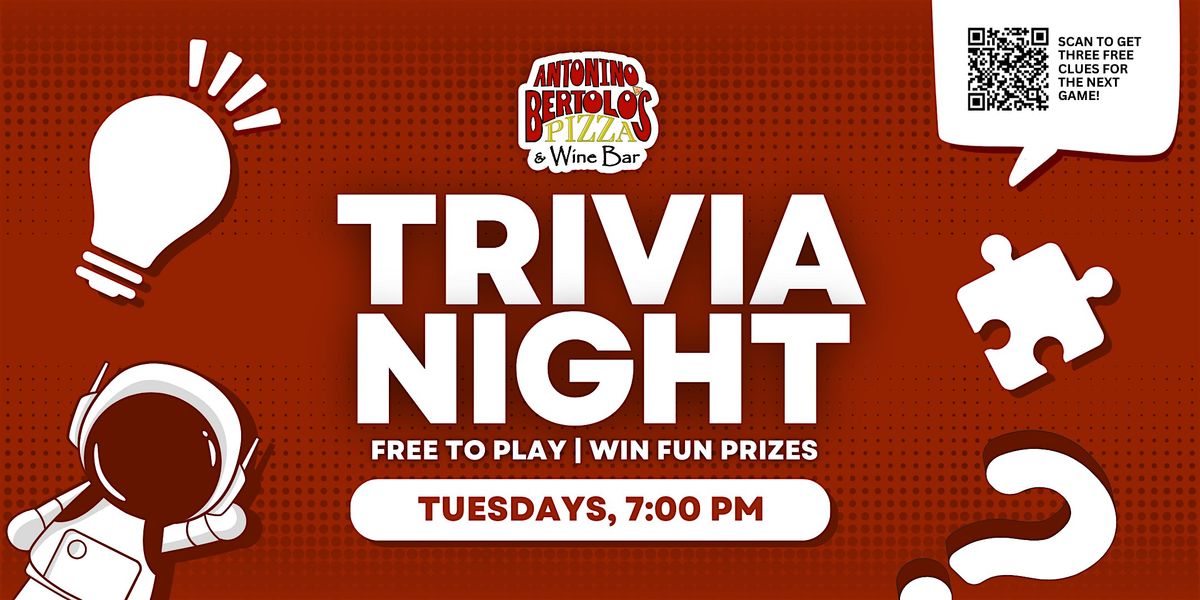 Join us for free live trivia every Tuesday at 7pm at Antonino Bertolo's Pizza & Wine Bar, located at 200 N Main St, Greenville, SC 29601! Free to play, and top teams win fun prizes!