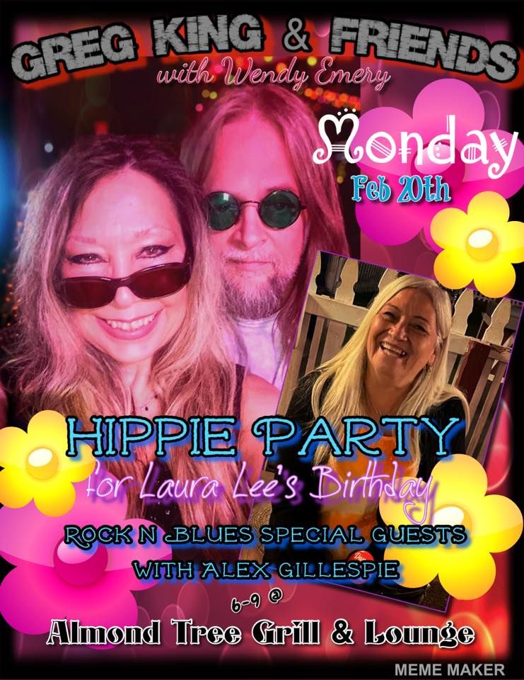 Join Greg King & Friends with Wendy Emery on Feb 20th and rock away those Monday blues! We’re havin a Hippie Party so dress up and come join us to celebrate Laura Lee Chavez’s birthday!!! We’ll play some 60’s & 70’s rock n blues tunes with Alex Gillespie on guitar! Special guests to be announced!!!! ???? It’s gonna be flower power, love and high vibes next Monday at The Tree! Rock and Blues! Acoustic show 6-9, enjoy happy hour 3-6. You never know who’s gonna walk in and join us! See you there!