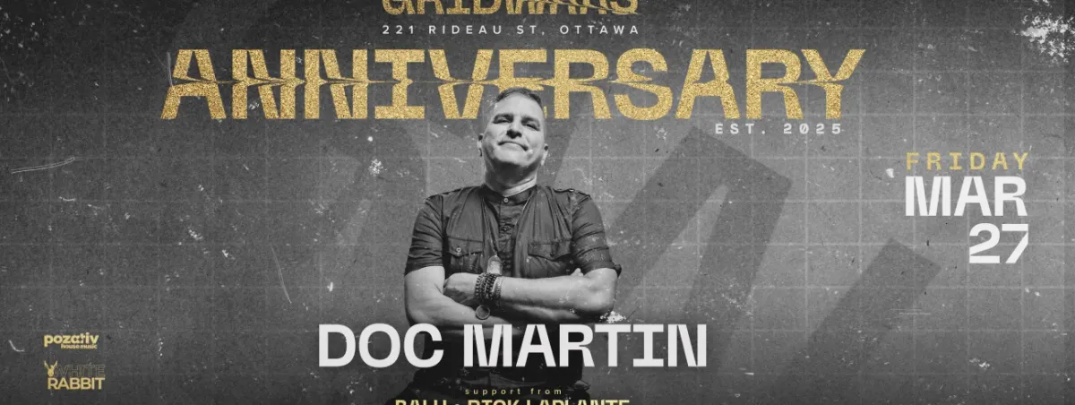 One year of GRIDWRKS, we're celebrating on March 27-28 weekend! Opening this space was a commitment to growing the City family and investing in the culture we believe in. Over the last twelve months, we’ve hosted new sounds, new collaborations, and new communities under one roof. It hasn’t been simple — growth never is — but the support from artists, promoters, and the dance floor has made it worthwhile. Thank you for backing the expansion and helping shape what GRIDWRKS has become._On Friday March 27th, we open our one-year anniversary weekend at GRIDWRKS with a true pillar of underground house music: Doc Martin.For more than three decades, Doc has been a constant presence on dance floors from San Francisco’s early acid house era to Panorama Bar in Berlin, Fabric in London, DC10 in Ibiza, and Coachella. A former tour DJ for Deee-Lite and a collaborator alongside artists like Daft Punk, Chemical Brothers, James Brown, and Grace Jones, he represents a rare bridge between rave history and the present moment. What defines him isn’t the résumé — it’s the dance floor. Long-form, immersive sets that move through deep, tribal, psychedelic, and tech-leaning house with patience and control. No trends. Just trust, flow, and culture.Co-presented by Pozativ (support by resident DJ Balu) and White Rabbit (support by resident DJ Rick Laplante), night one brings together an international architect of the underground and the local forces who helped shape GRIDWRKS’ first year.__From 10pm19+ ID RequiredTickets & Tables Packages via TicketscandyLimited tickets at the door (first-come, first-served)Non-refundable___GRIDWRKS221 Rideau St. Ottawa, ONwww.gridwrks.ca