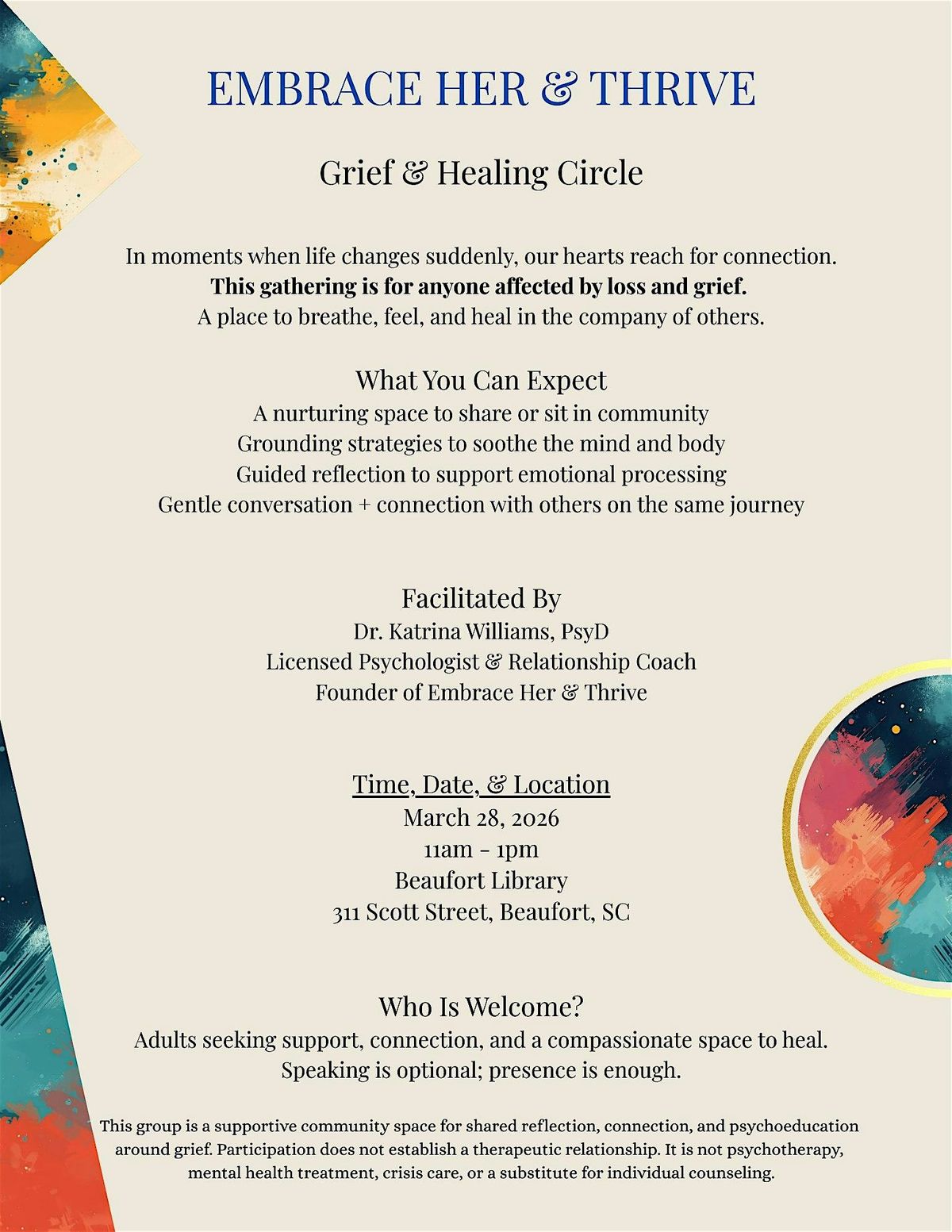 Join us for a gentle, welcoming grief support circle designed to provide connection, reflection, and practical tools for navigating loss. In this small group setting, participants will have the opportunity to share (if they wish), listen, and learn ways to move through grief with compassion for themselves.