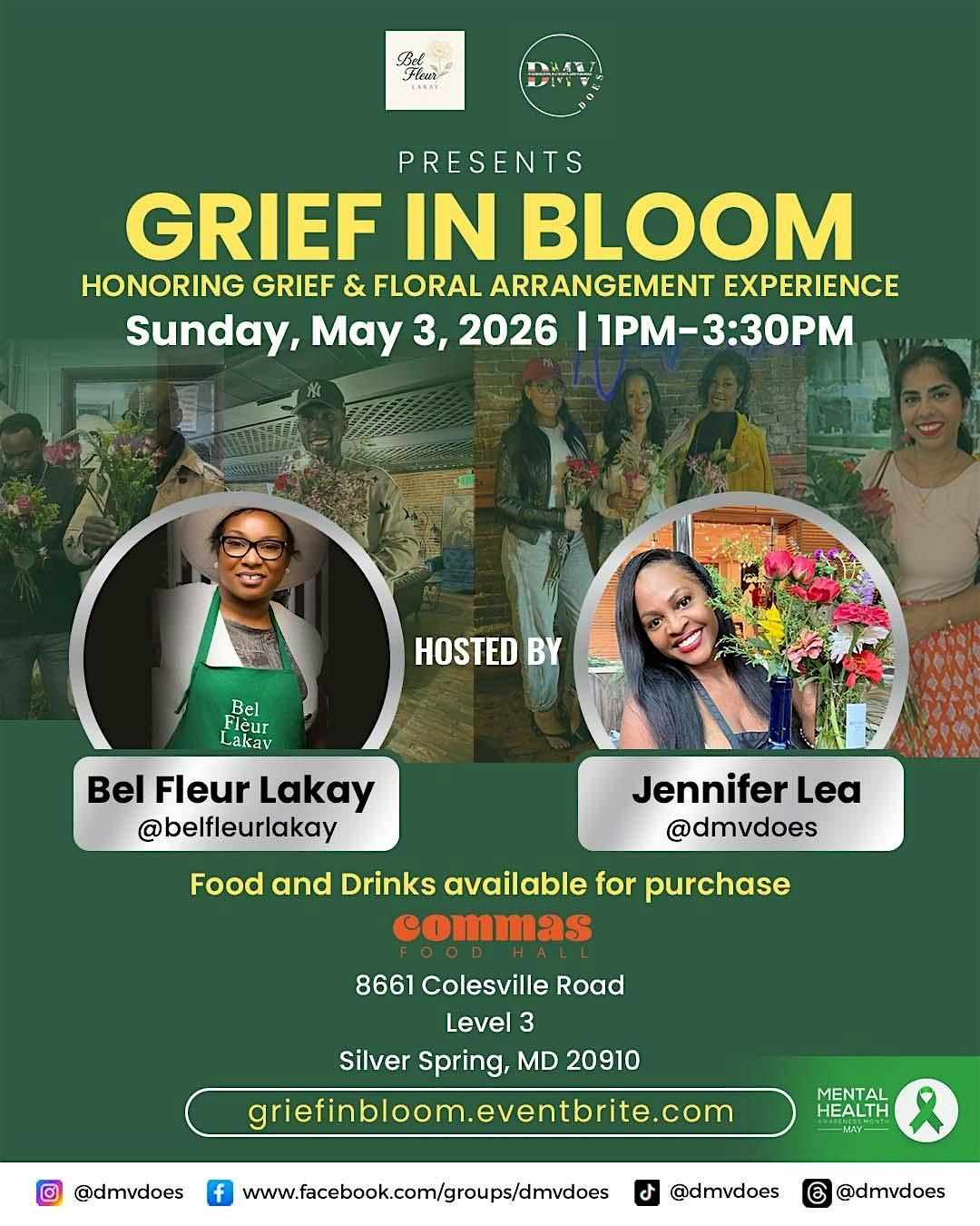 Hosted by Cassie from Bel Fleur Lakay and Jennifer Lea of DMV Does, this gathering will allow guests to come together in community and gently explore grief in a supportive and beautiful setting. Through flowers, conversation, and shared experience, we will honor loved ones, acknowledge our journeys, and create something beautiful as a symbol of love, memory, and healing.
