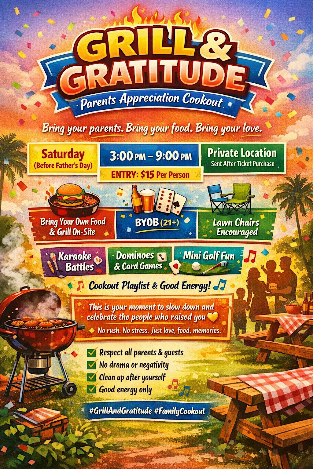 🍔 Bring Your Own Food & Grill On-Site