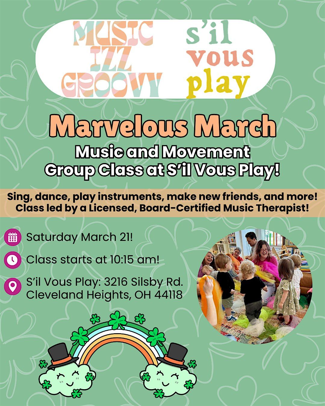 Music Izz Groovy is so grateful to partner with S'il Vous Play to offer inclusive music & movement classes for kiddos from 0-6 years of all abilities. Groovy Group classes may include opportunities for instrument playing, singing, dancing, finger play, cuddle time, story time, and more!