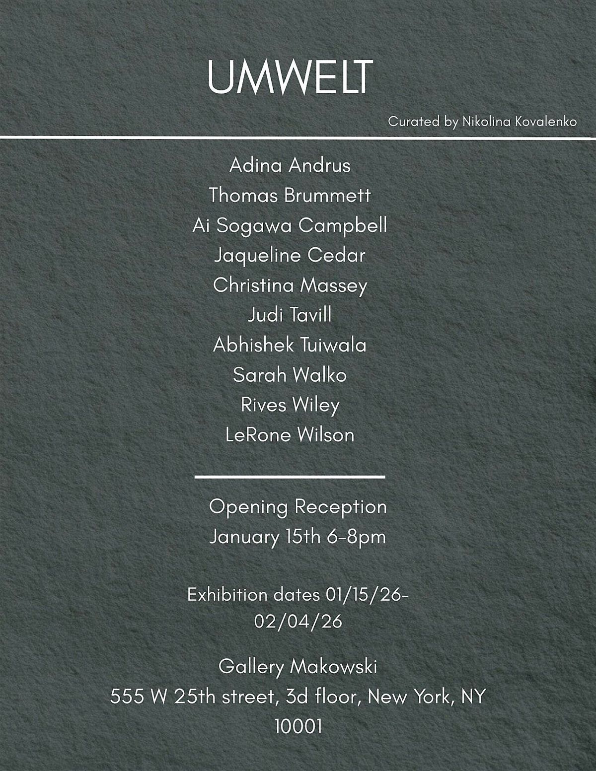 UMWELT Group Exhibition Umwelt is a group exhibition that explores the idea of the subjective universe - the unique perceptual world each individual inhabits. Borrowed from the field of ethology, the term Umwelt describes how every organism experiences reality through its own sensory, emotional, and cognitive filters. What we perceive as “reality” is never singular, but shaped by biology, memory, culture, and inner world.